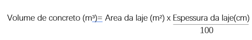 Para transformar a medida de sua laje de centímetro para metro, é necessário dividir por 100 a espessura de sua laje. Se a laje possuir 10cm de espessura, após a divisão, teremos 0,1 metros. Portanto para calcular o volume total de concreto, conforme equação abaixo, multiplicamos 50m² de área total, por 0,1 metros (espessura) e chegaremos aos 5 metros cúbicos de concreto (m³) serão necessários.