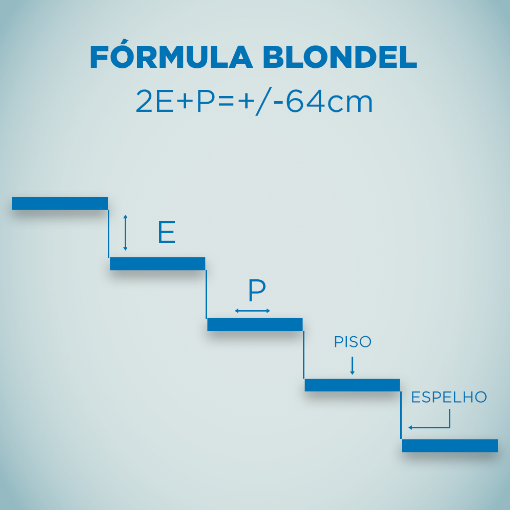 Para conseguir concluir o cálculo para dimensionar a escada, é essencial ter duas informações: a altura do espelho – o degrau – (e) e o comprimento do passo (p), que é onde a pessoa apoiará o pé.